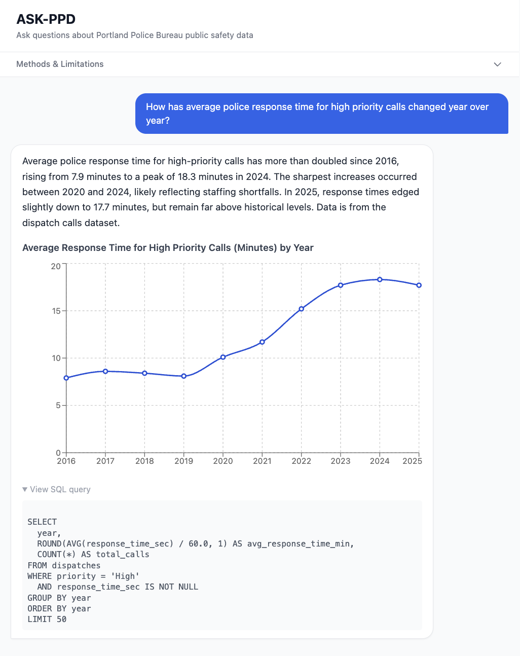 ASK-PPD makes 10 years of Portland Police Bureau open data accessible to anyone who can type a question. Ask something like "which neighborhoods have the slowest police response times?" or "how has motor vehicle theft trended since 2015?" and get a plain-English answer with a supporting chart — no SQL or data skills required.