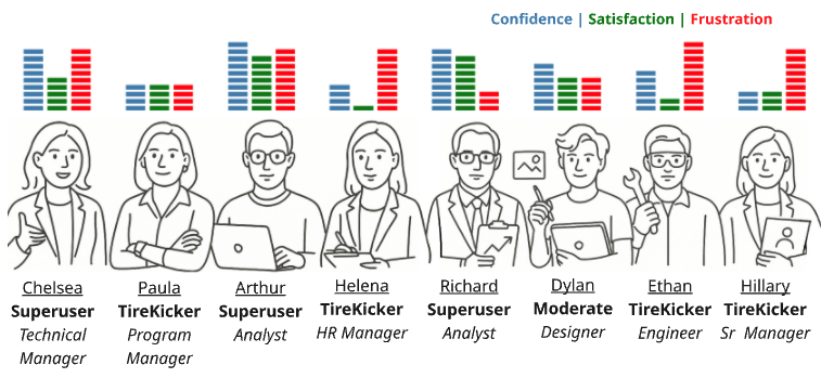 I made this user persona graphic for our final presentation. It was based on data gathered in our VOC interviews, and informed by our company-wide survey. For the Confidence, Satisfaction and Frustration score graphs, I used data from our VOC interviews and made the charts in python.