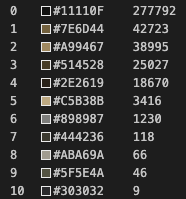 c_code occurrence 0 #11110F 277792 1 #7E6D44 42723 2 #A99467 38995 3 #514528 25027 4 #2E2619 18670 5 #C5B38B 3416 6 #898987 1230 7 #444236 118 8 #ABA69A 66 9 #5F5E4A 46 10 #303032 9