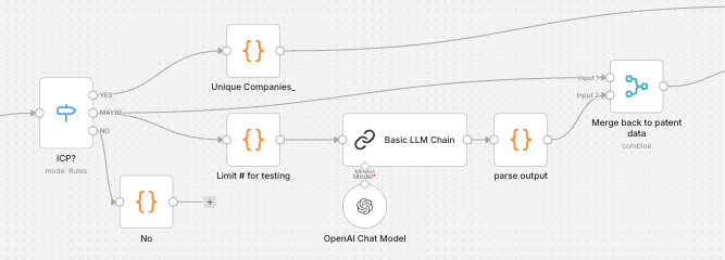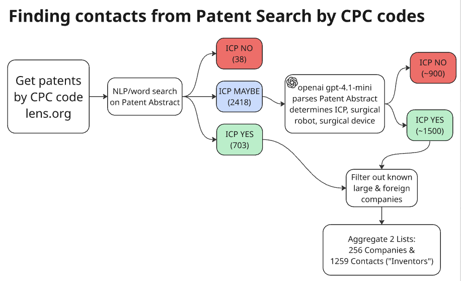 Then I instructed an LLM (openai gpt-4.1 mini) on how to specifically classify ICP (Yes/No). I tested various models using the same limited abstracts; 4.1 mini was a clear winner, best with niche technical detail. I fed the Maybe bin through the classifier and got 1500 patents. I filtered out known large companies that did not fit ICP size limits, then aggregated the data to create organization and contacts lists.
