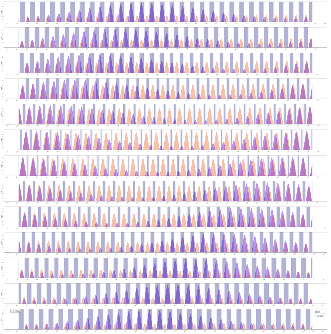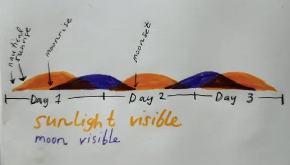 Each row charts one cycle new moon to new moon, the sun height in the sky is in gold and moon height in purple and the nights are represented by blue-grey bands.